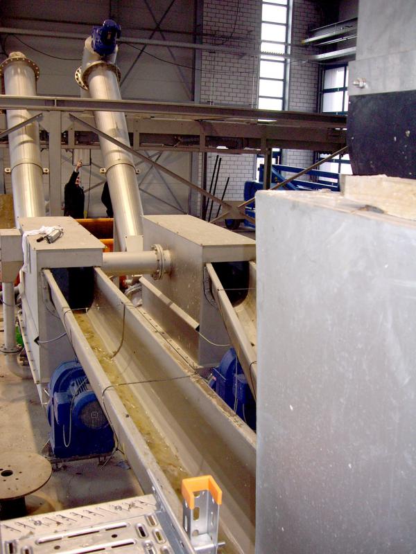 Screenings are conveyed from a screening unit to the trough of the launder unit. Flushing water is introduced at the end of the trough, which flushes the screenings to the wash compactor. The flushing water can be drawn off by a pump behind the screening unit or taken from an industrial water supply network. An arch can be installed to protect downstream machinery from damage.